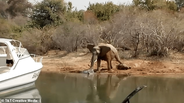 When the rescuers approach in a boat, the agitated mother charges at them and splashes her trunk in the lake, signaling her distress.