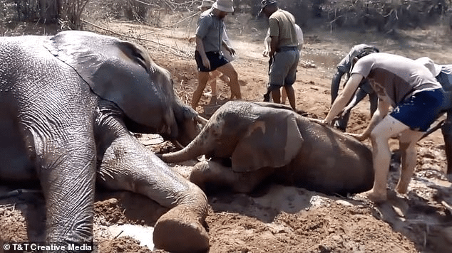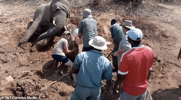 A baby elephant has been saved by the courageous efforts of an anti-poaching group, the Bumi Hills Foundation, after being trapped in a mud pit for two days in the sweltering heat.