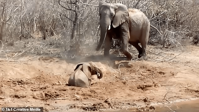 Despite the mother’s desperate attempts, the baby elephant struggles to keep its head above the thick mud.