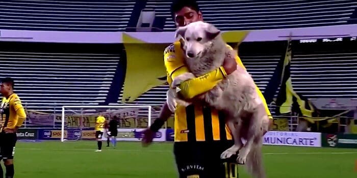 During a soccer match in Bolivia, a heartwarming incident unfolded when an adorable stray dog took center stage, capturing the attention and affection of both players and spectators alike.