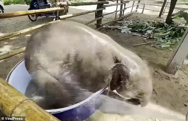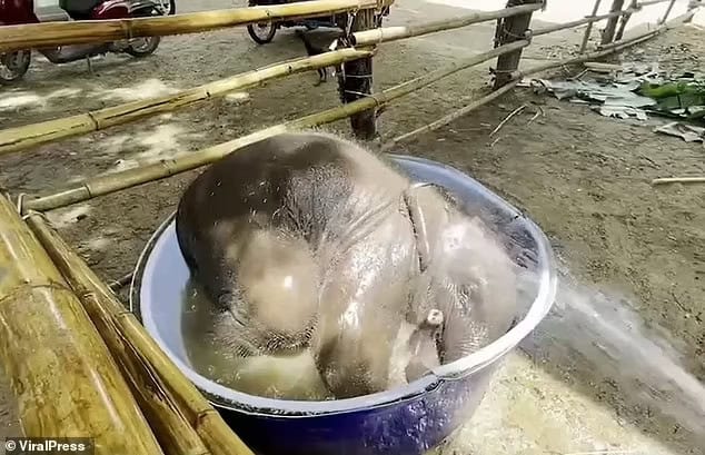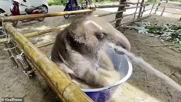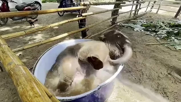The charming footage features the seven-month-old elephant, Choojai, gleefully soaking in a plastic tub.